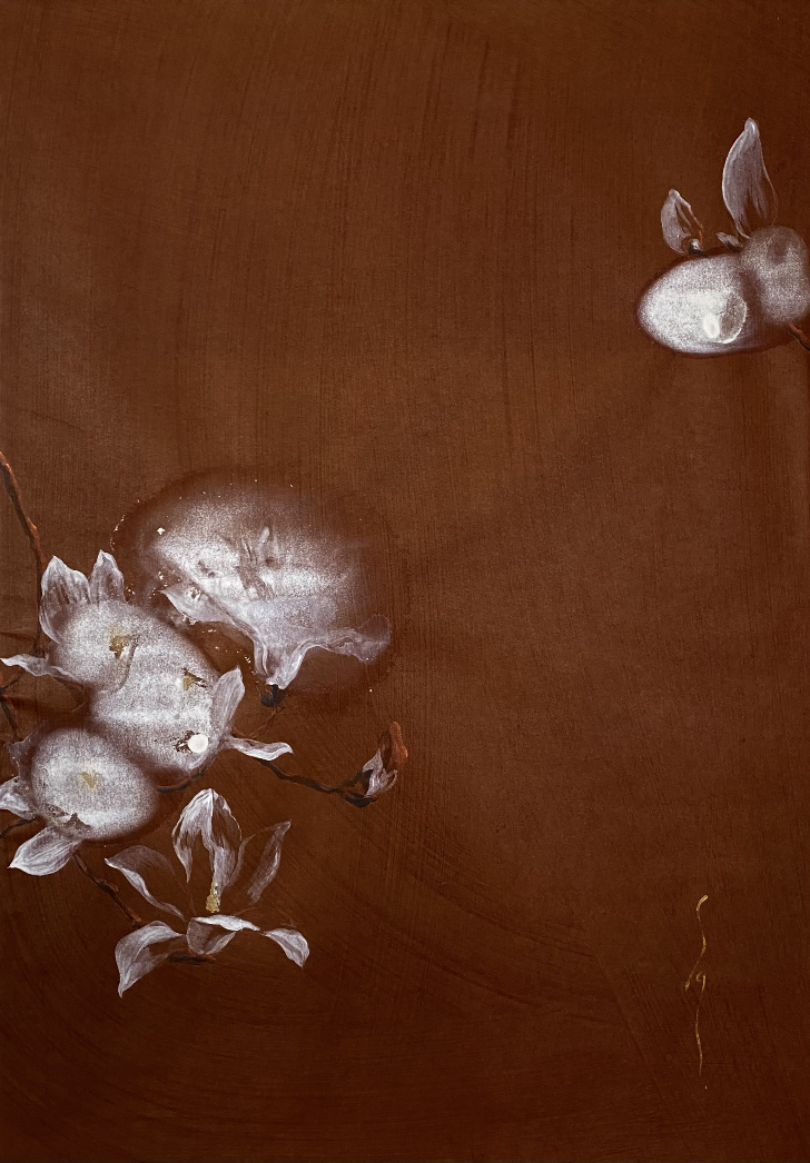 1|「雪の白木蓮」652×455mm 素材:柿渋紙,アクリル絵の具,水 技法:零度染™︎,加筆/One world Festivarl展示/大阪/2025