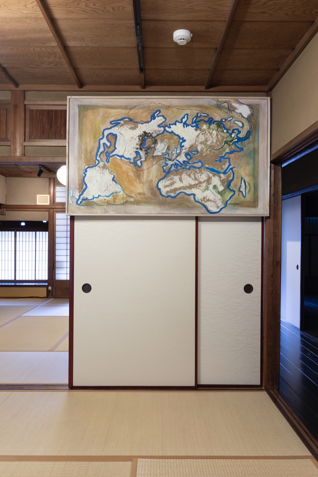 5|「逃げ水をすくう」絵画・インスタレーション/〈世界地図 World Map〉キャンバスに油彩, モデリングペースト, 京壁材, ピスタチオの殻/ The Terminal Kyoto, 京都, 2024